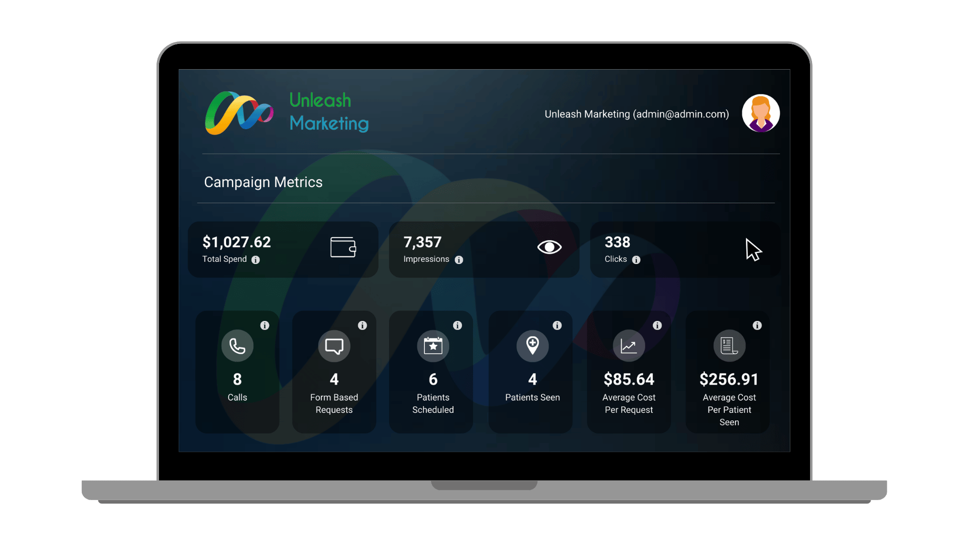 Easy to digest metrics like Total Spend, Number of Clicks and Cost Per New Patient and more.